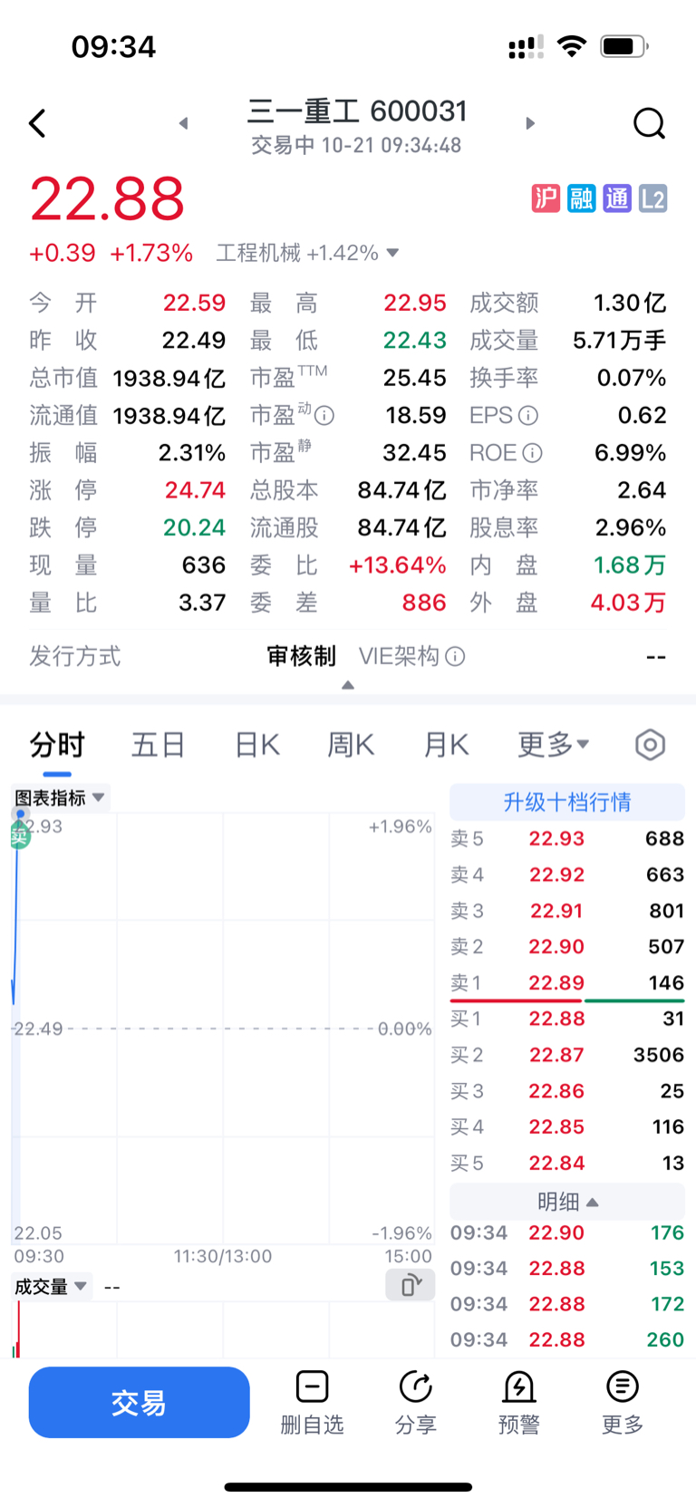 $三一重工(SH600031)$ 昨天23.02卖,尾盘22.4买,今天22.90卖,等下跌到22.3又可以买