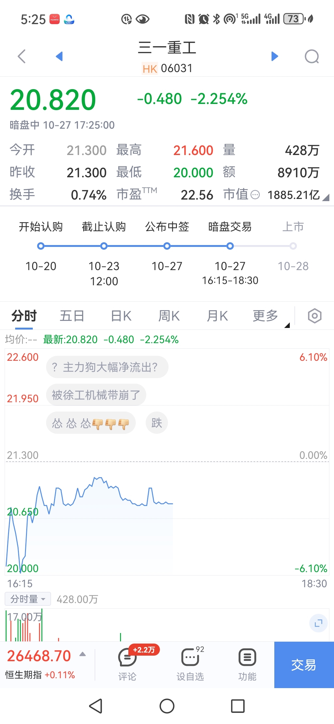 三一港股暗盘交易破发了,看看尾盘会不会拉起来,不然明天悬了,难怪今天大A直接吃面