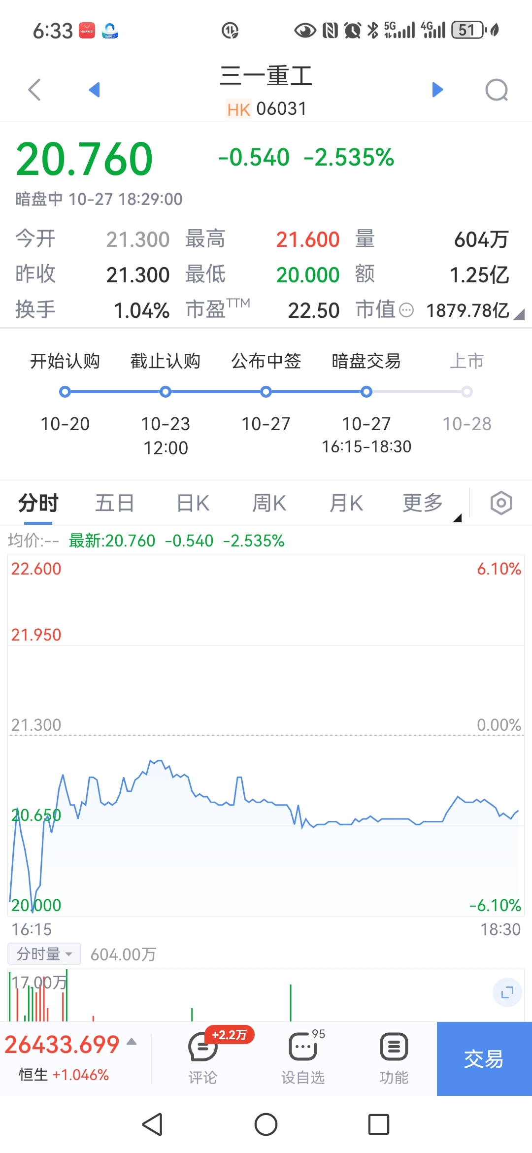 $三一重工(SH600031)$ 明天香港上市的四个新股只有三一重工暗盘是跌的,其它三个都是暴涨的,看来明天又要吃面了,哎呀,太不争气了。