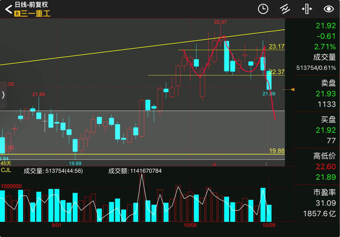 $三一重工(SH600031)$ 已经破位了,小头部已经形成,开盘低开已斩半仓,计划21部分接回
