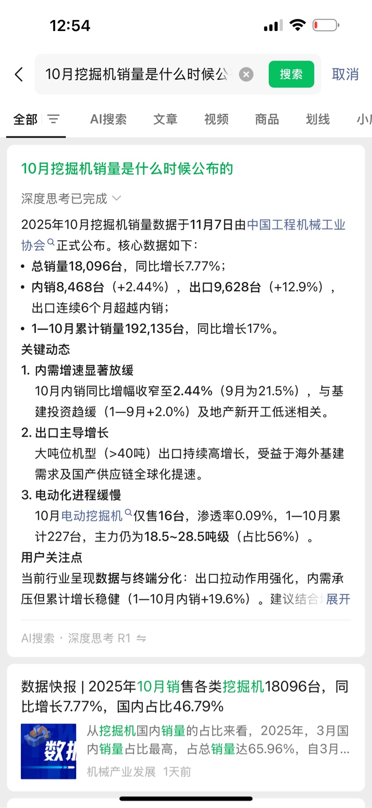 9月份挖掘机比去年同期增长百分之21,10月份同比去年只增长百分之7,估计是这个
