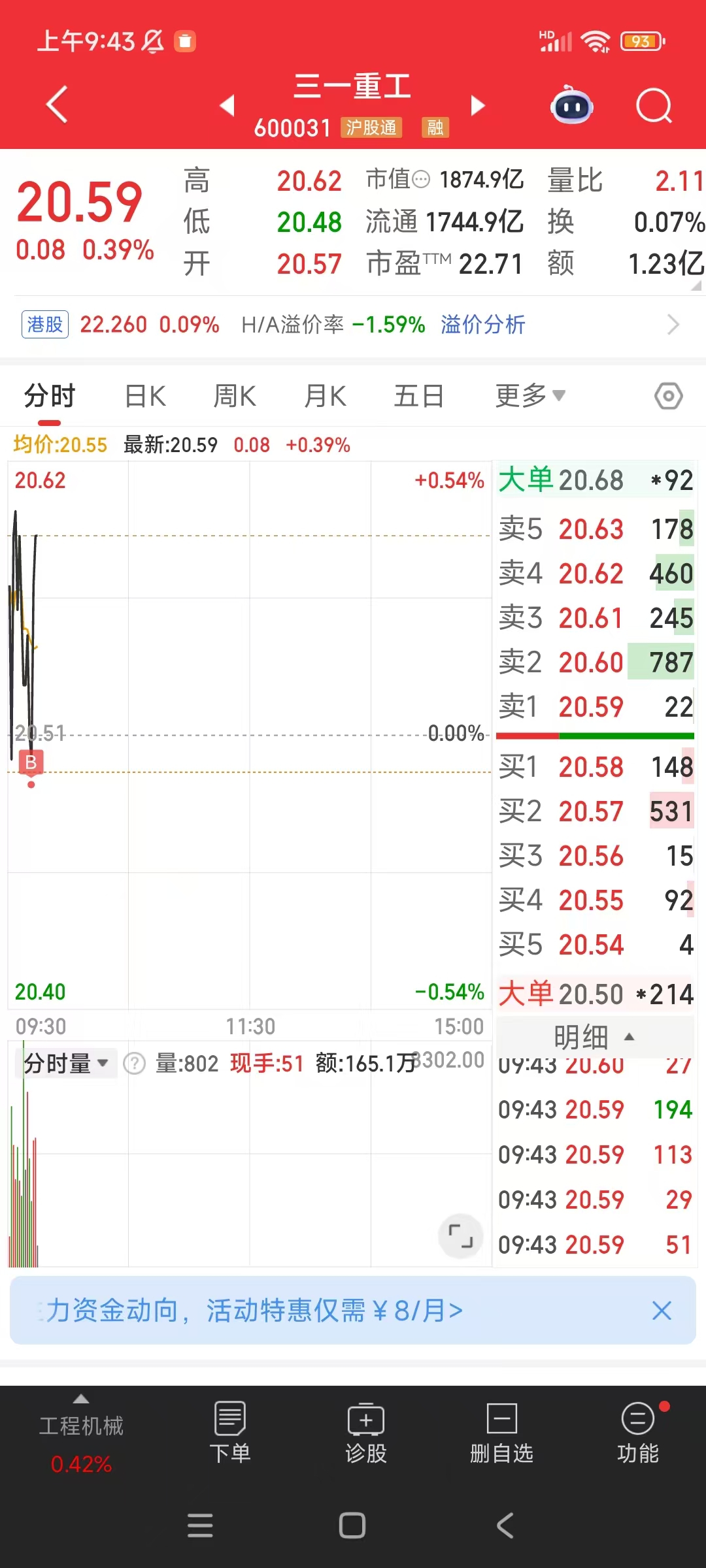 $三一重工(SH600031)$ 20.49买1/4仓位
