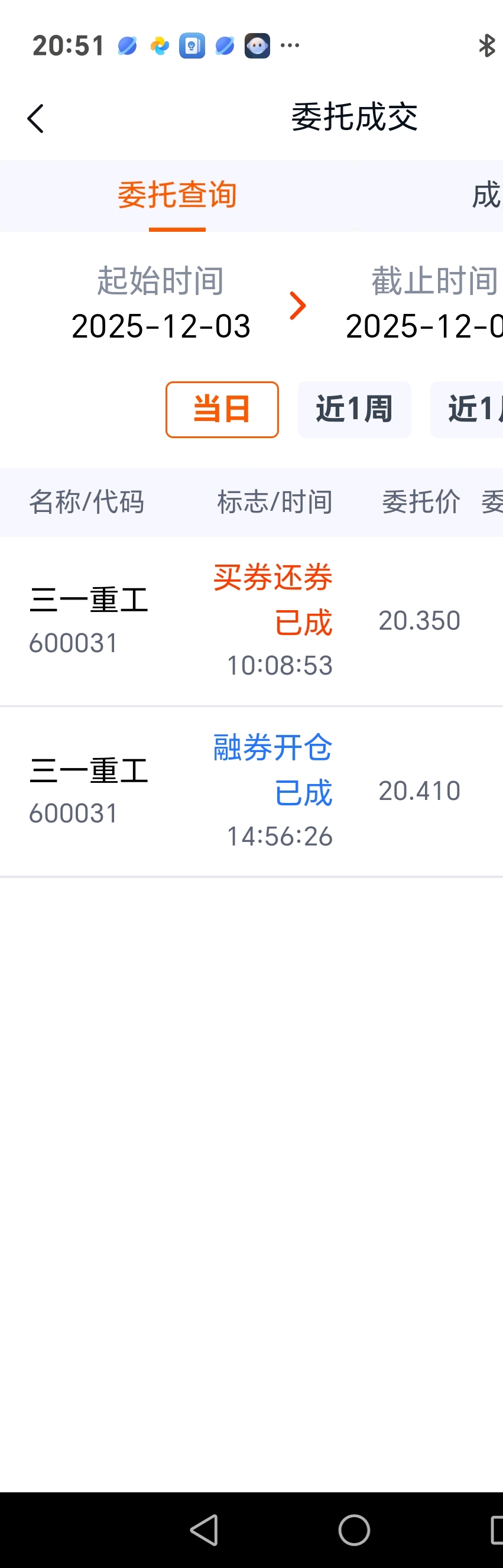 $三一重工(SH600031)$ 今天本想获利了结了,早上看的强势上涨了,所以还券了!没想到收盘前看了一下,发现还是上不去,既然上不去,那得继续探底了,所以又卖券了,不过也T了6分钱,几千块的工资又有了!