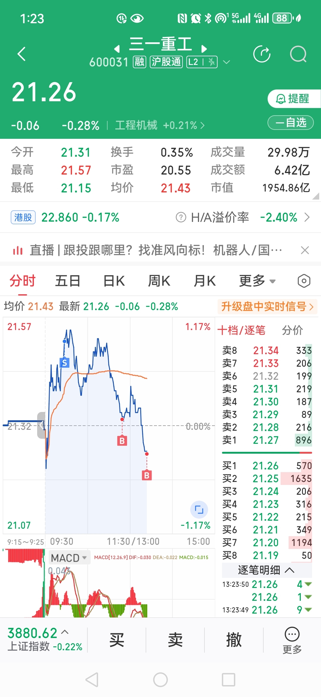 $三一重工(SH600031)$ 看到红盘直接踢了,绿盘毫不犹豫进了。跟着主力做踢,不然又是后悔的一天。