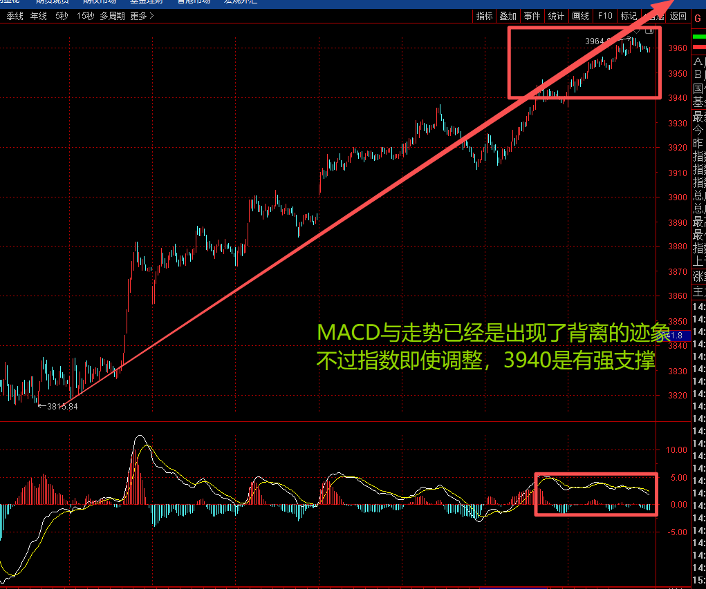 从缠论的拆解指数的走势,从3815见底之后,形成一笔小级别的向上趋势,这笔小级别的向上趋势,已经是形成的背驰的结构,即使背驰啊,小级别的走势也是不至于就向下持续走弱的,从缠论的角度推演今天指数的走势,应该是震荡了,走出来一个中枢结构,今天继续八连阳的可能性不是很大。