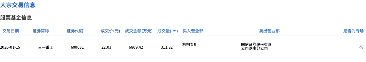 1月15日,三一重工大宗交易成交311.82万股,成交额6869.42万元,占当日总成交额的5.13%,成交价22.03元,较市场收盘价22.25元折价0.99%。