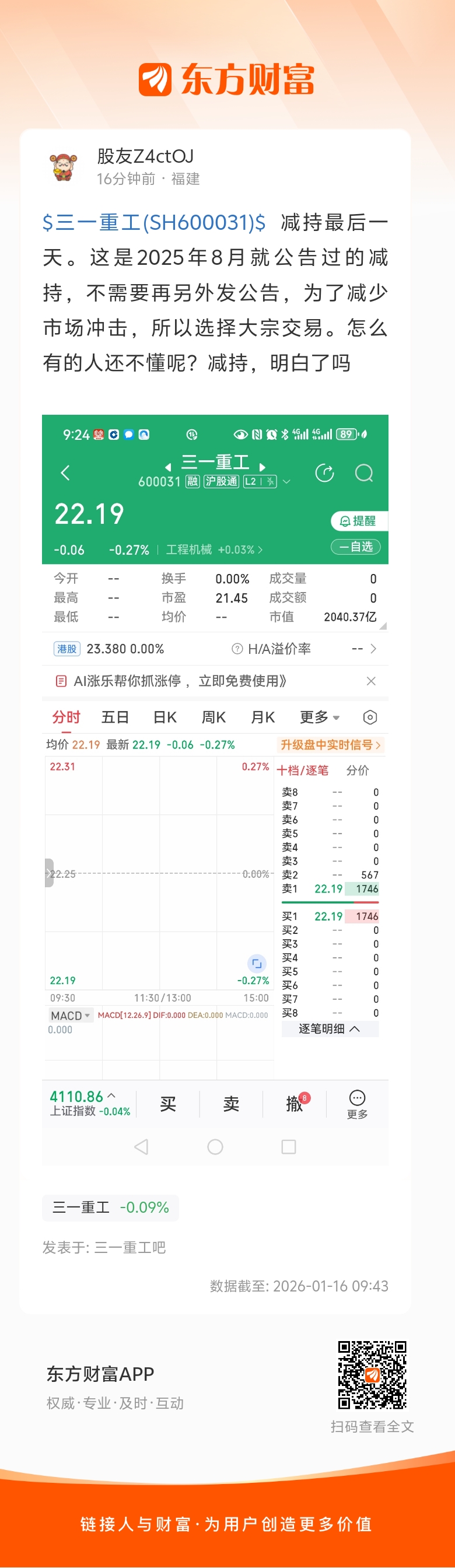$三一重工(SH600031)$ 减持最后一天。这是2025年8月就公告过的减持,不需要再另外发公告,为了减少市场冲击,所以选择大宗交易。怎么有的人还不懂呢?减持,明白了吗