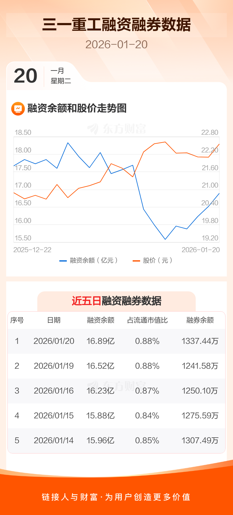 交易所最新数据显示,三一重工于2026年1月20日获融资买入1.43亿元,融资偿还1.06亿元,当日融资净买入3762.94万元。目前,该股融资余额16.89亿,占流通市值比例为0.88%。