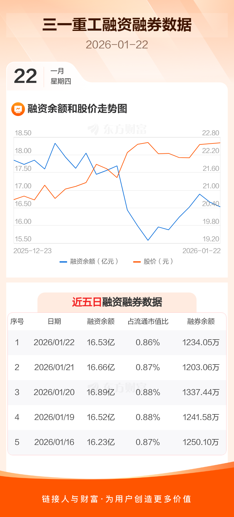 交易所最新数据显示,三一重工于2026年1月22日获融资买入6893.27万元,融资偿还8050.64万元,当日融资净偿还1157.37万元。目前,该股融资余额16.53亿,占流通市值比例为0.86%。