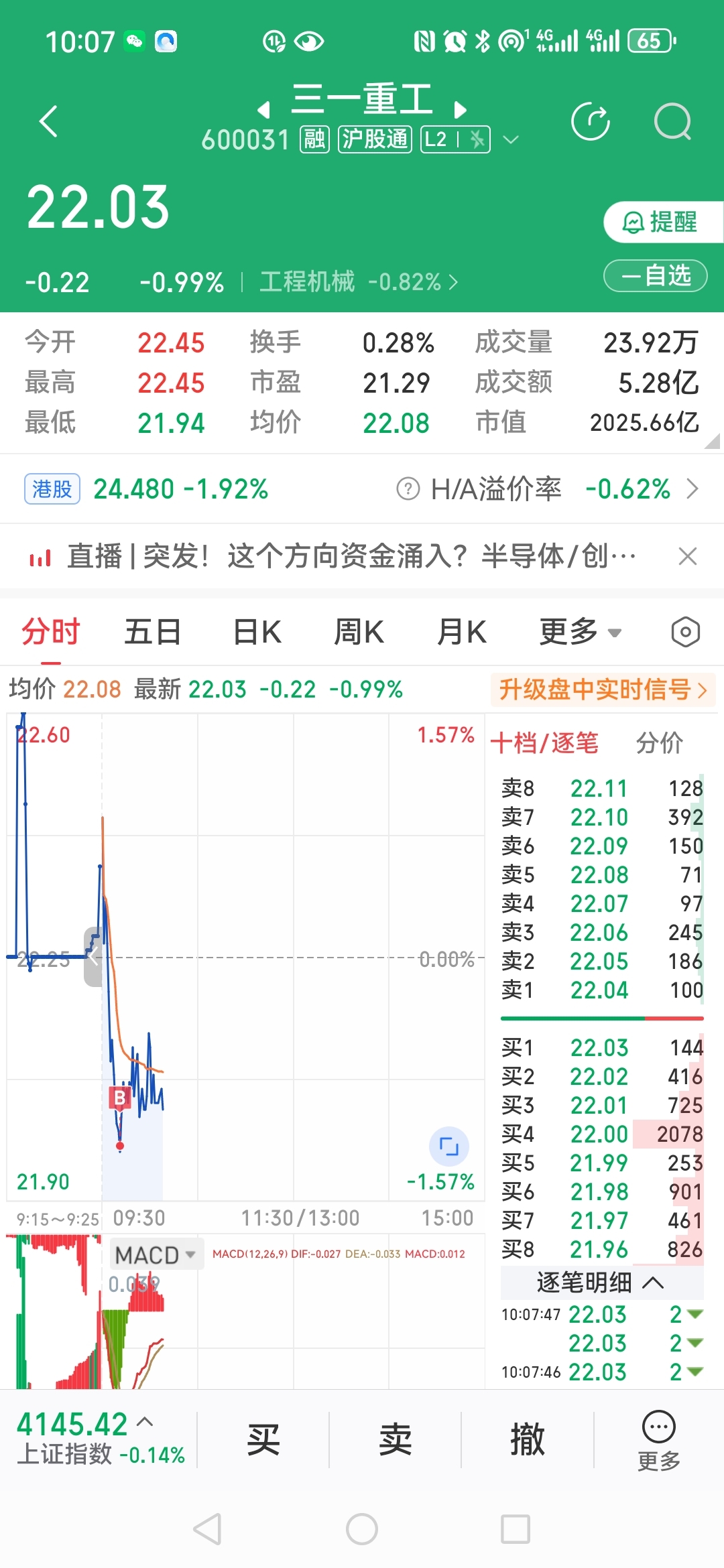 $三一重工(SH600031)$ 竞价的时候诱多22.60,开盘高开22.45,让散户接盘,开盘后直接砸下来,可见主力多么想跑出去。明显的诱多。