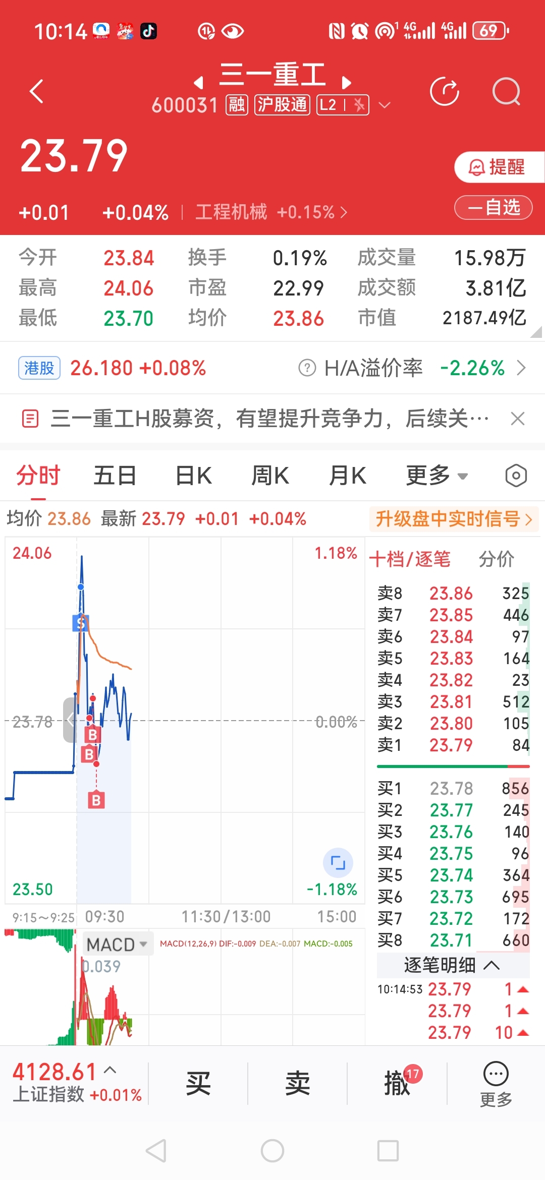 $三一重工(SH600031)$ 0.25的差价,够手续费了,