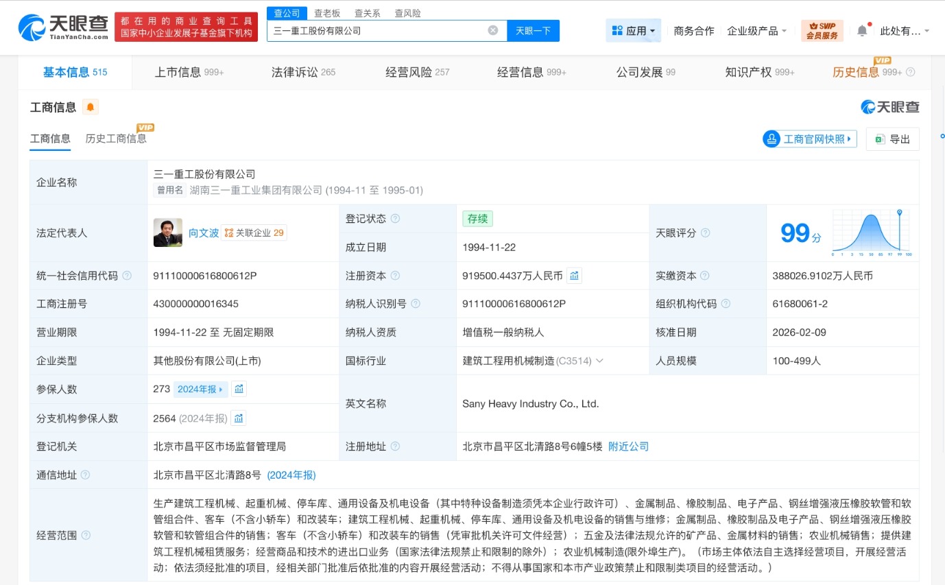 每经AI快讯,天眼查App显示,近日,三一重工(600031)发生工商变更,注册资本由约84.74亿人民币增至约91.95亿元人民币,增幅约8.5%。三一重工股份有限公司成立于1994年11月,法定代表人为向文波,经营范围含生产建筑工程机械、起重机械、停车库、通用设备及机电设备等的销售与维修,提供建筑工程机械租赁服务,经营商品和技术的进出口业务等。股东信息显示,该公司由三一集团有限公司、香港中央结算有限公司、梁稳根等共同持股。