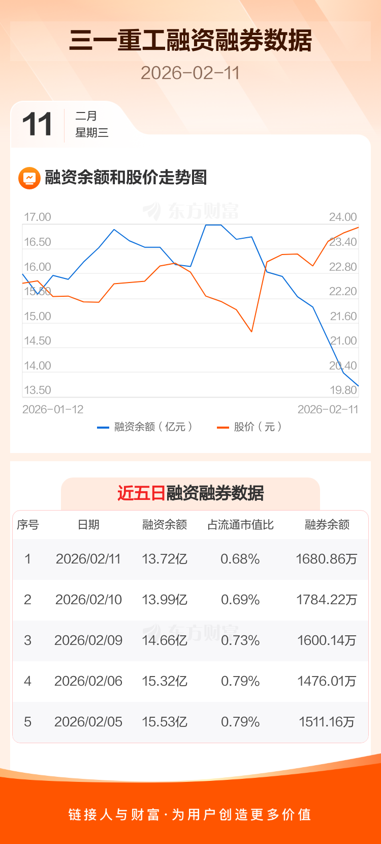 交易所最新数据显示,三一重工于2026年2月11日获融资买入6482.99万元,融资偿还9191.06万元,当日融资净偿还2708.08万元。目前,该股融资余额13.72亿,占流通市值比例为0.68%。