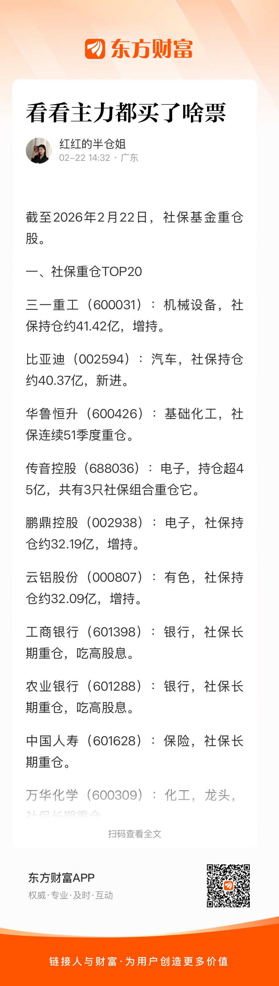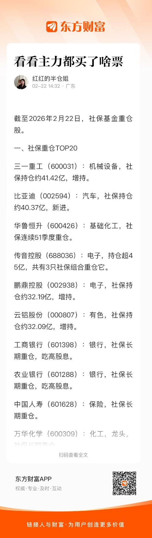 截至2026年2月22日,社保基金重仓股。