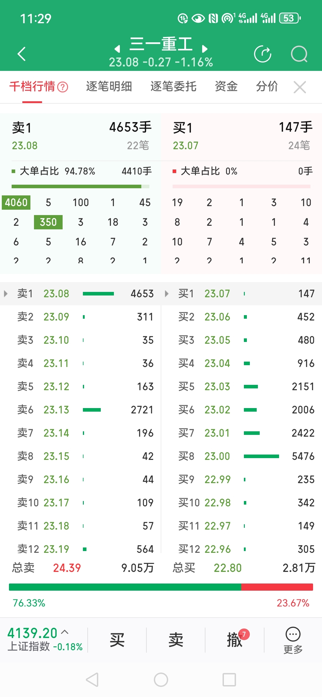 $三一重工(SH600031)$ 早上23.58不跑,现在23.08大单逃出,什么情况?