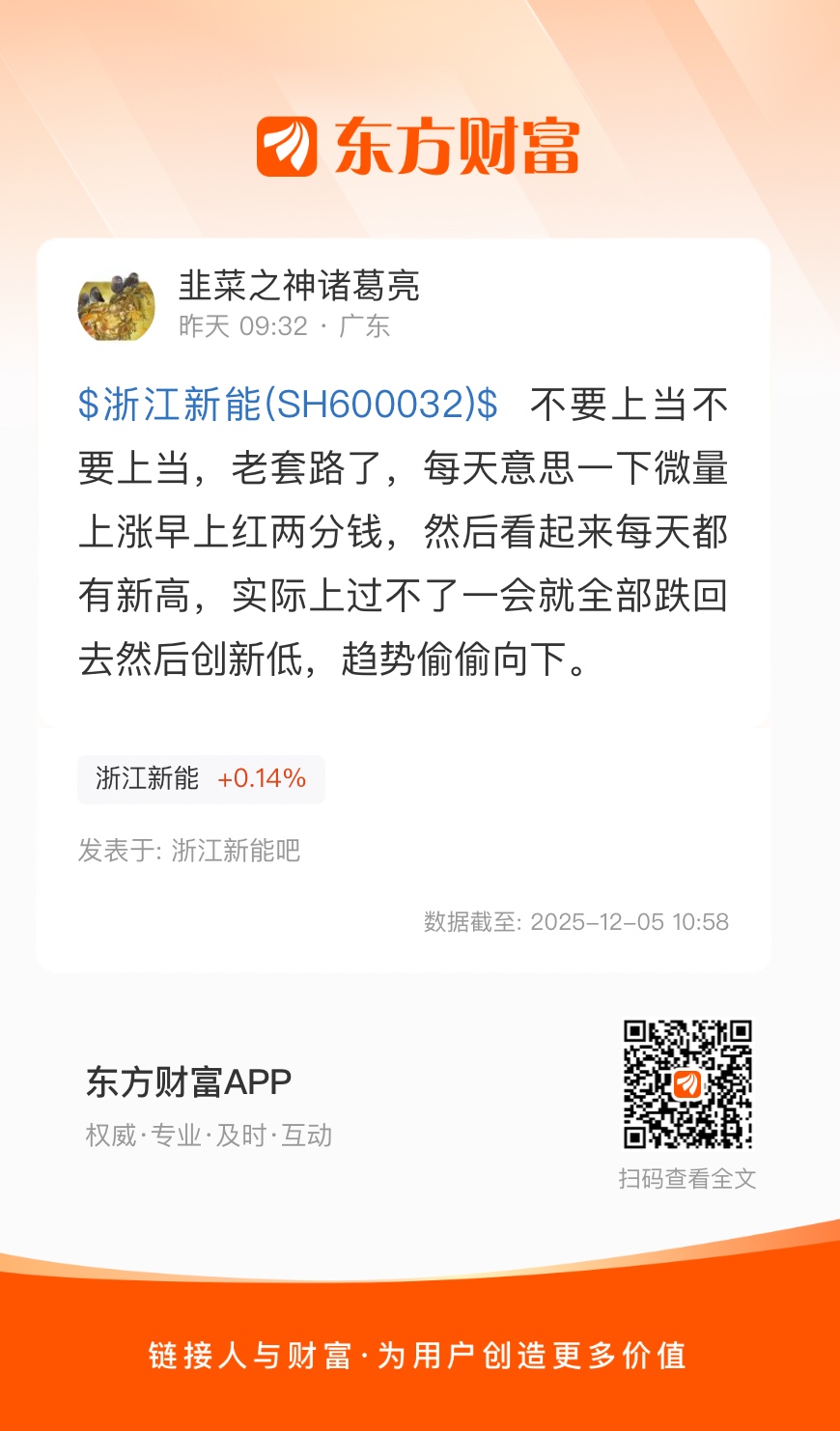 $浙江新能(SH600032)$ 不要上当不要上当,老套路了,每天意思一下微量上涨早上红两分钱,然后看起来每天都有新高,实际上过不了一会就全部跌回去然后创新低,趋势偷偷向下。