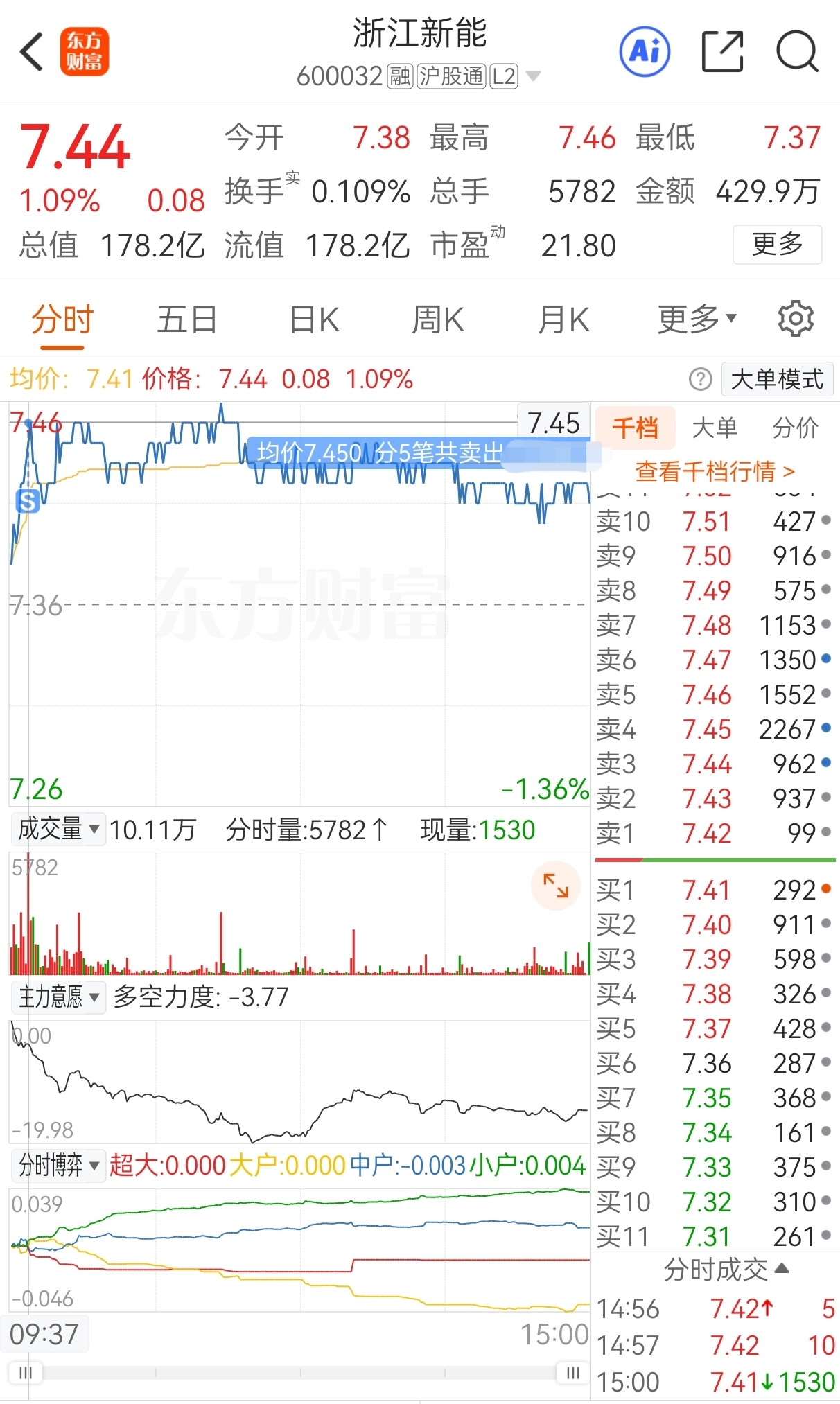 $浙江新能(SH600032)$ 原计划今买明卖,实际7.36买,一直持股不动,7.45卖,实盘短线套利浙江新能,成功收米走人!