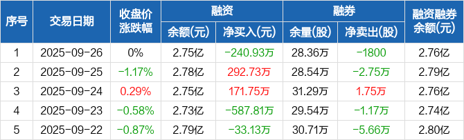 融资方面,当日融资买入616.57万元,融资偿还857.5万元,融资净偿还240.93万元。融券方面,融券卖出100股,融券偿还1900股,融券余量28.36万股,融券余额95.57万元。融资融券余额合计2.76亿元。