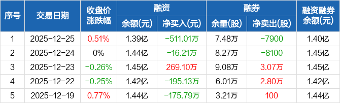 楚天高速:融资净偿还511.01万元,融资余额1.39亿元(12-25)