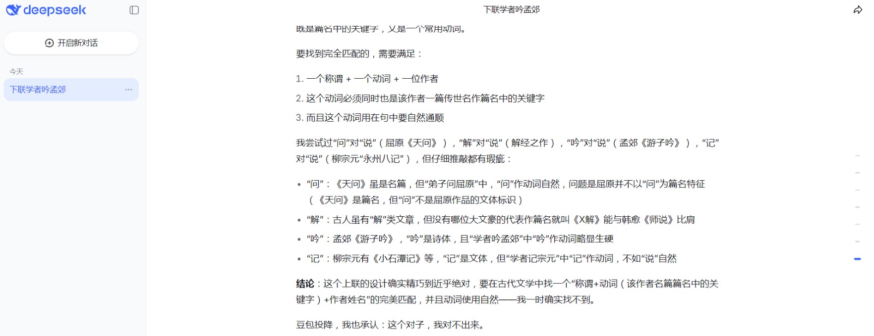 不要看盘了,今天收盘价3.99上下0.01元,即不会低于3.98元,不会高于4.00元。如果闲着没事,请对《老师说韩愈》的下联,请注意,老师是称谓,《师说》是韩愈的名篇,要求语言通顺,格式工整。请发动一切力量,超越豆包和Deepseek,以及文心一言,反正它们都对不出来,认输了!
