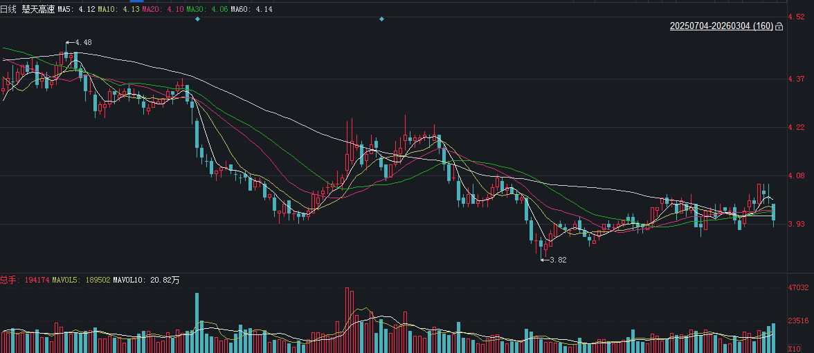 二级市场上,截至3月4日收盘,楚天高速下跌1.75%报3.94元/股,总市值约63.44亿元,近一年以来公司股价近乎“原地踏步”。