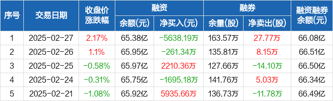 招商银行:融资净偿还5638.19万元,融资余额65.38亿元(02-27)