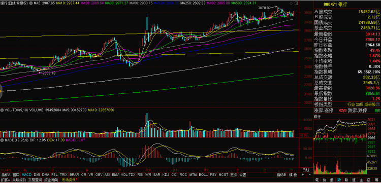 通达信数据显示,5日银行指数上涨1.67%,报3014.13点,收复了近期失守的所有均线。