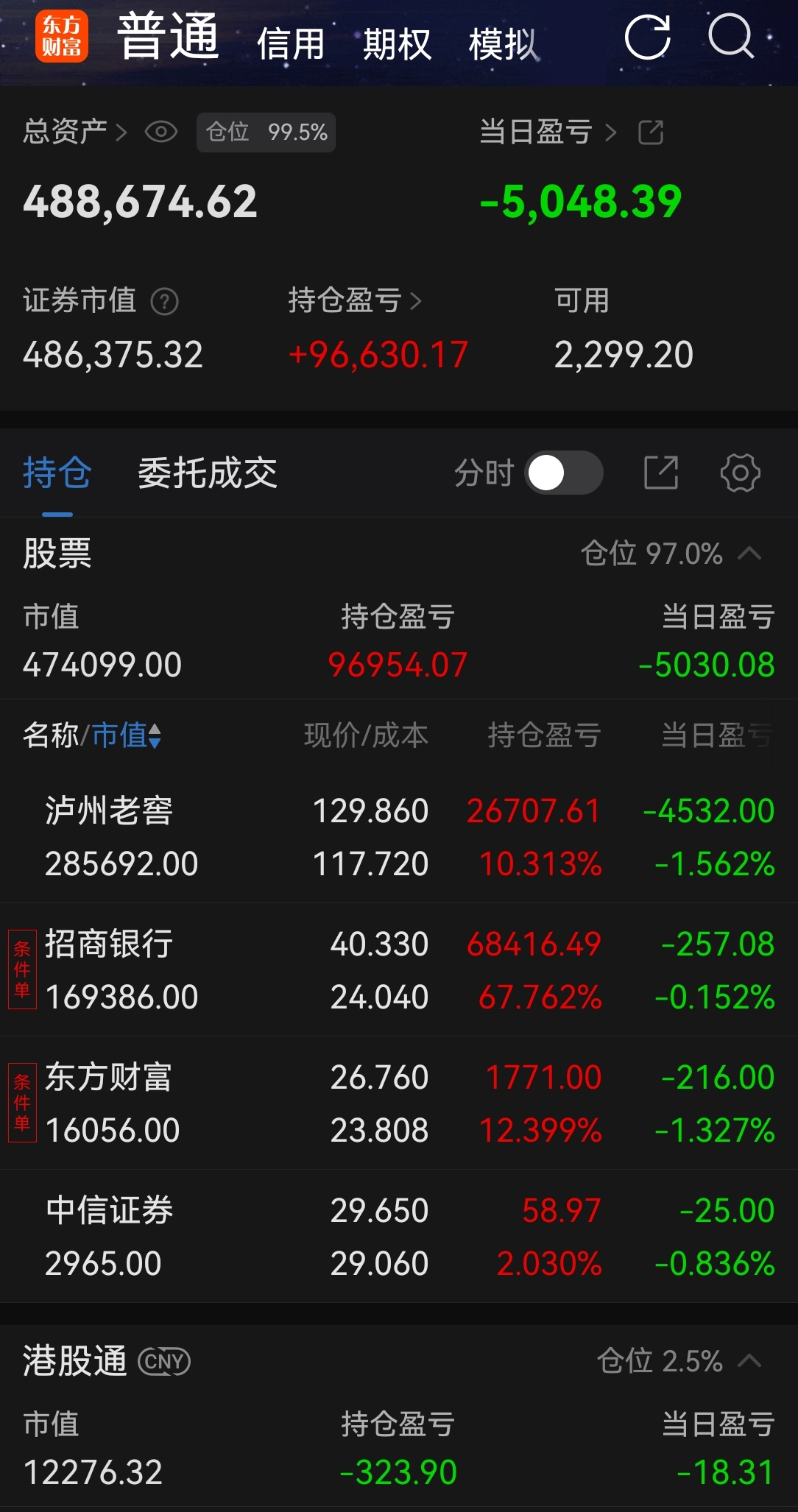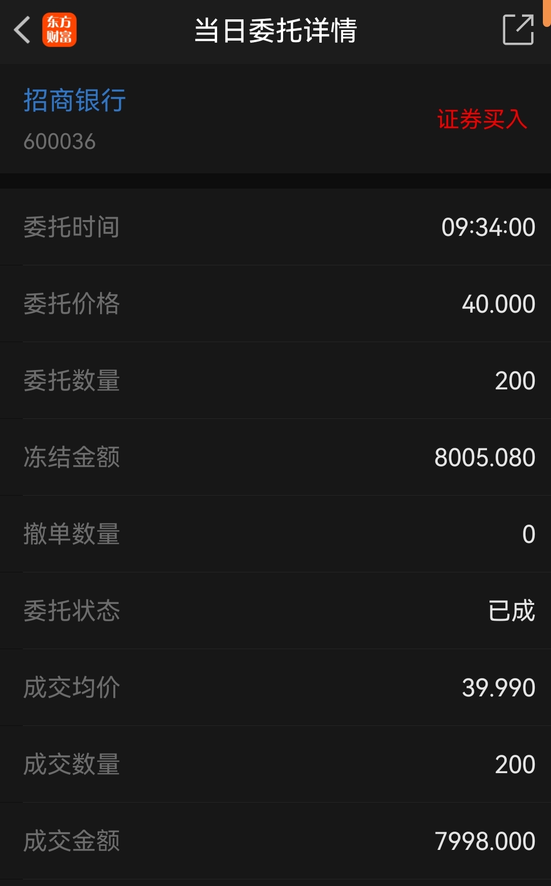 今天浮亏5048元。上午招行跌破了40元,进入了我的加仓区间,条件单自动买入了2