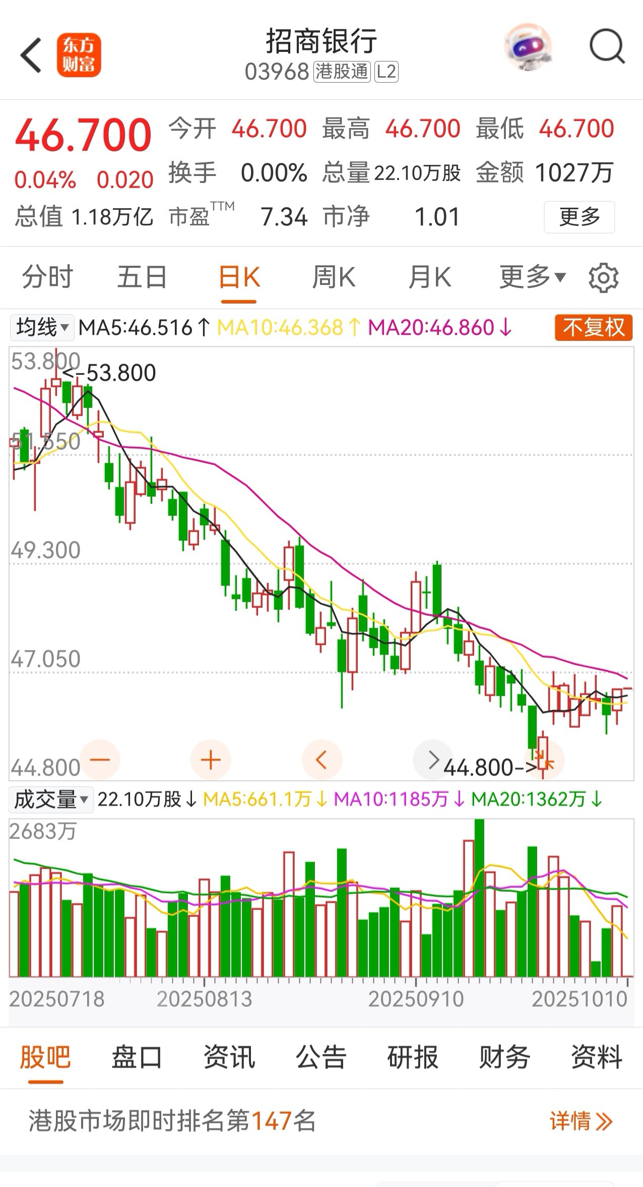 招行H股9月26日下探44.80元后,已涨了5%,这几天已拒绝下跌了。