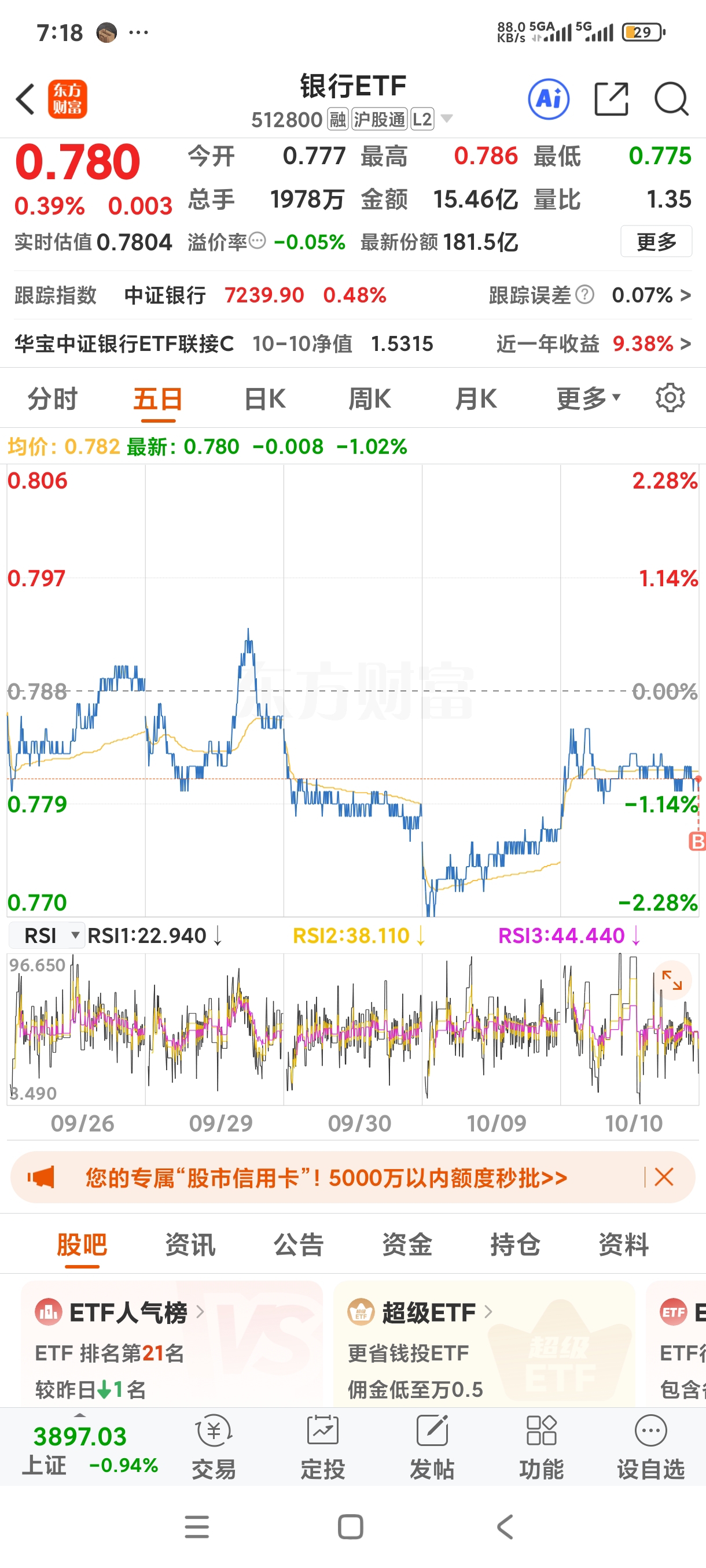 $招商银行(SH600036)$ 尾盘进了一下银行etf,不知道是对是错,感觉炒etf的没几个高手,想问一下这个贴吧里面有人知道吗?下周一要是大盘猛跌的话,银行能逆势崛起吗,现在的位置要是再跌的话可以加仓吗?还是下跌趋势下跌中继。求高手解答
