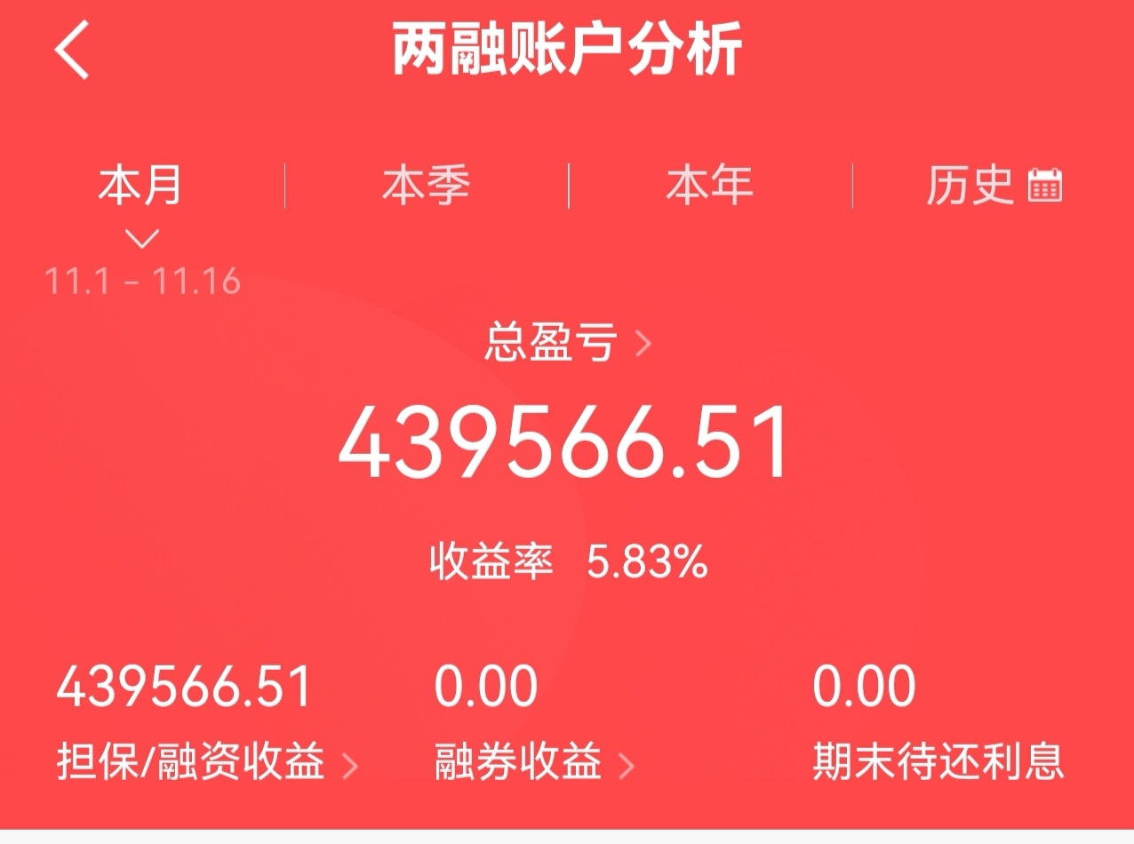 截止到11月14日收盘,我的两融帐户,11月份总盈利439566.51元,收益率5.83%