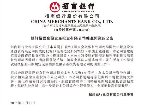 中国网财经11月24日讯近日,招商银行发布公告显示,该行收到《国家金融监督管理总局关于招银金融资产投资有限公司开业的批复》(金复[2025]667号)。根据上述批复,该行筹建的招银金融资产投资有限公司获准开业。招银金融资产投资有限公司注册资本为人民币150亿元,为招商银行全资子公司。