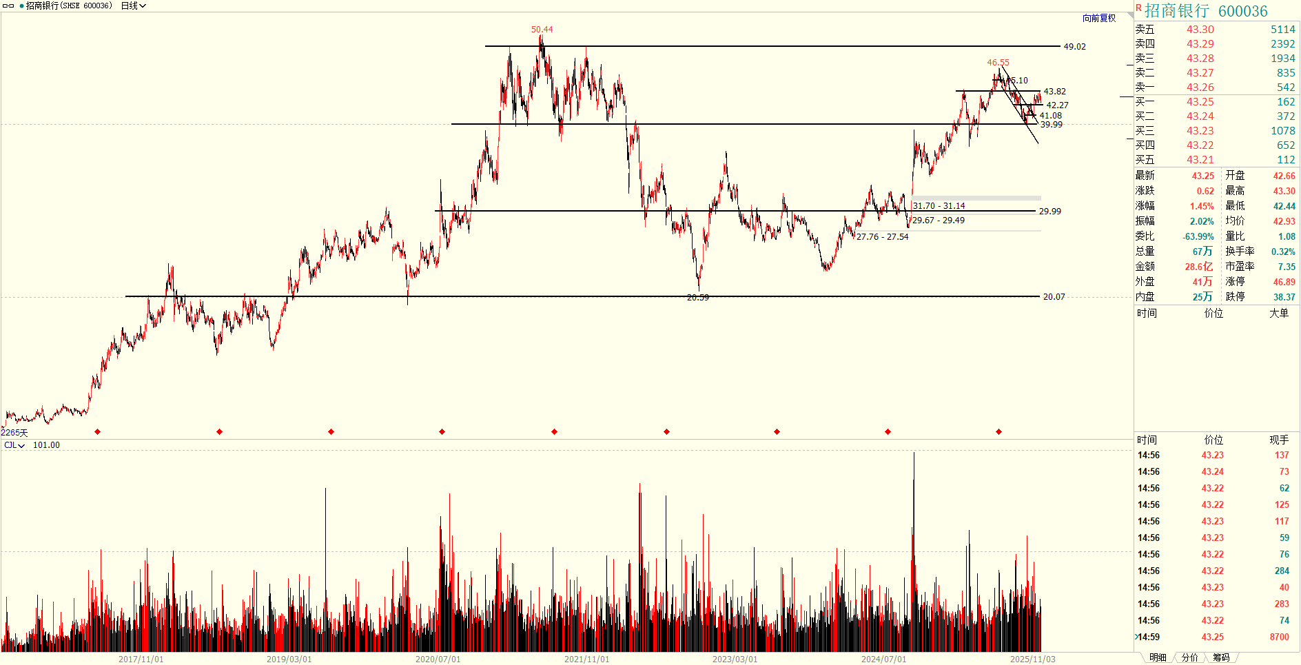 一把直尺打天下/招商银行总体呈上涨结构,46.55-40之间的下跌,为大级别调整