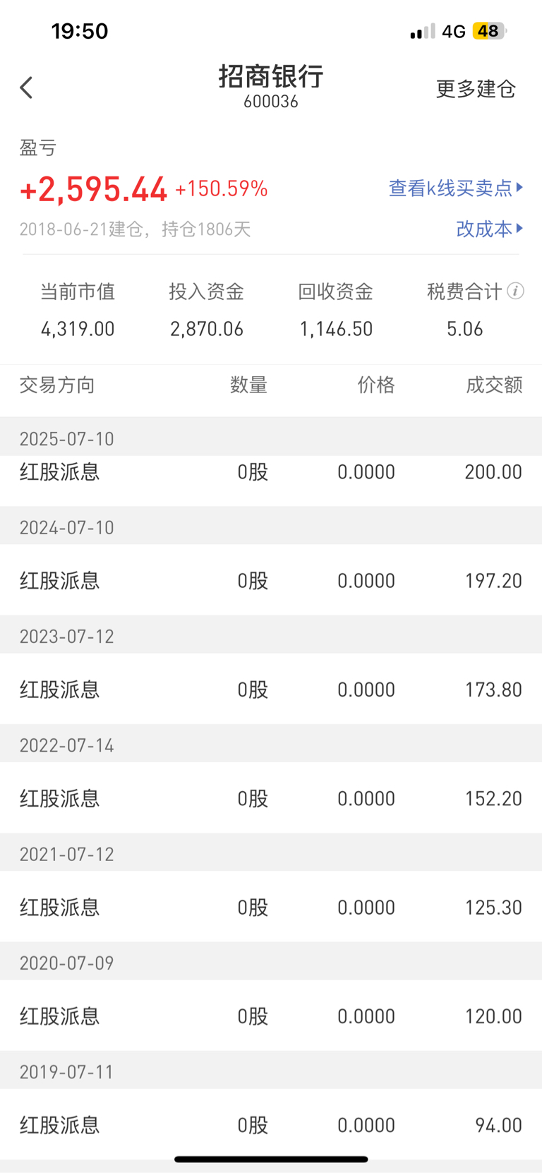 $招商银行(SH600036)$ 100股测试分红,拿了8年观察用