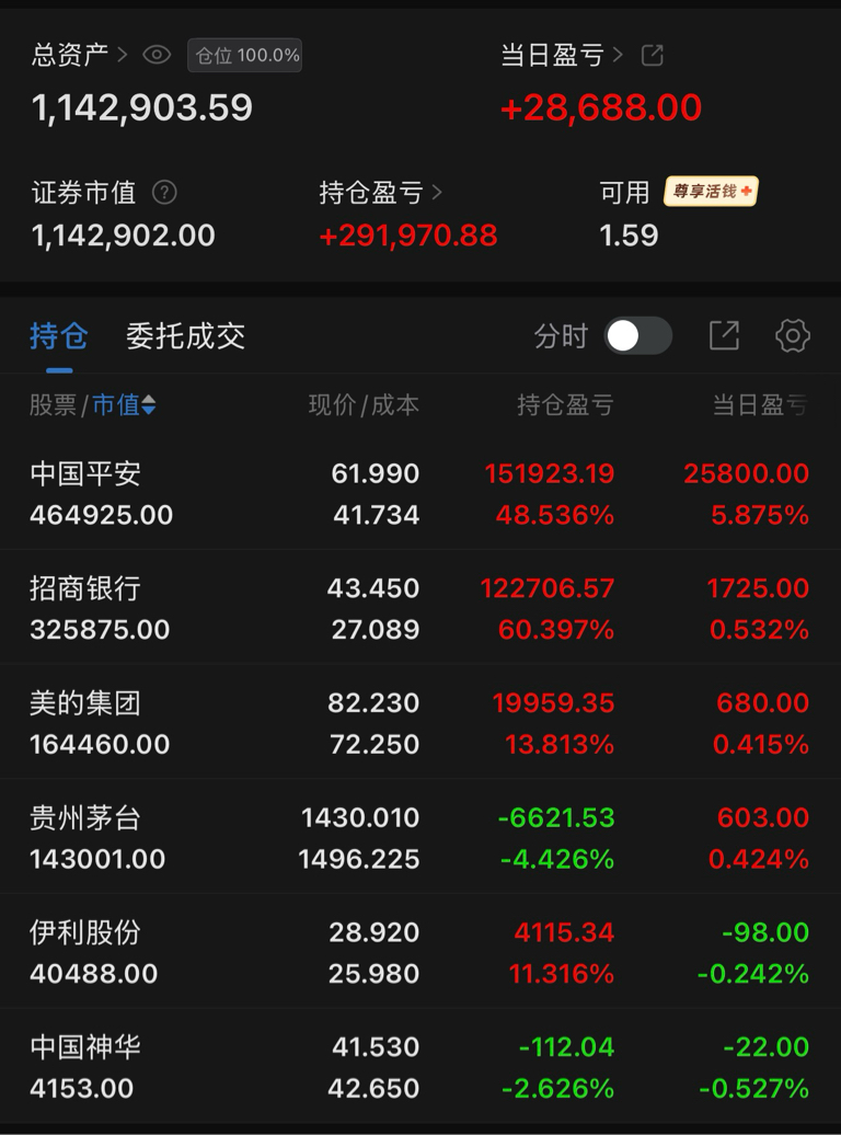 $招商银行(SH600036)$ $中国平安(SH601318)$ $美的集团(SZ000333)$ 钱掉下来的时候,你要在现场是吧?希望分红到账前别涨。平安每股营利10元,分掉36.6%,10-3.66=6.34,假设5年每股营利不涨,6.34*5=31.7加上当前价,31.7+62=93.7,pb一倍的情况下也要到93。什么时候到,就交给市场情绪了。我尽可能复投加看好。
