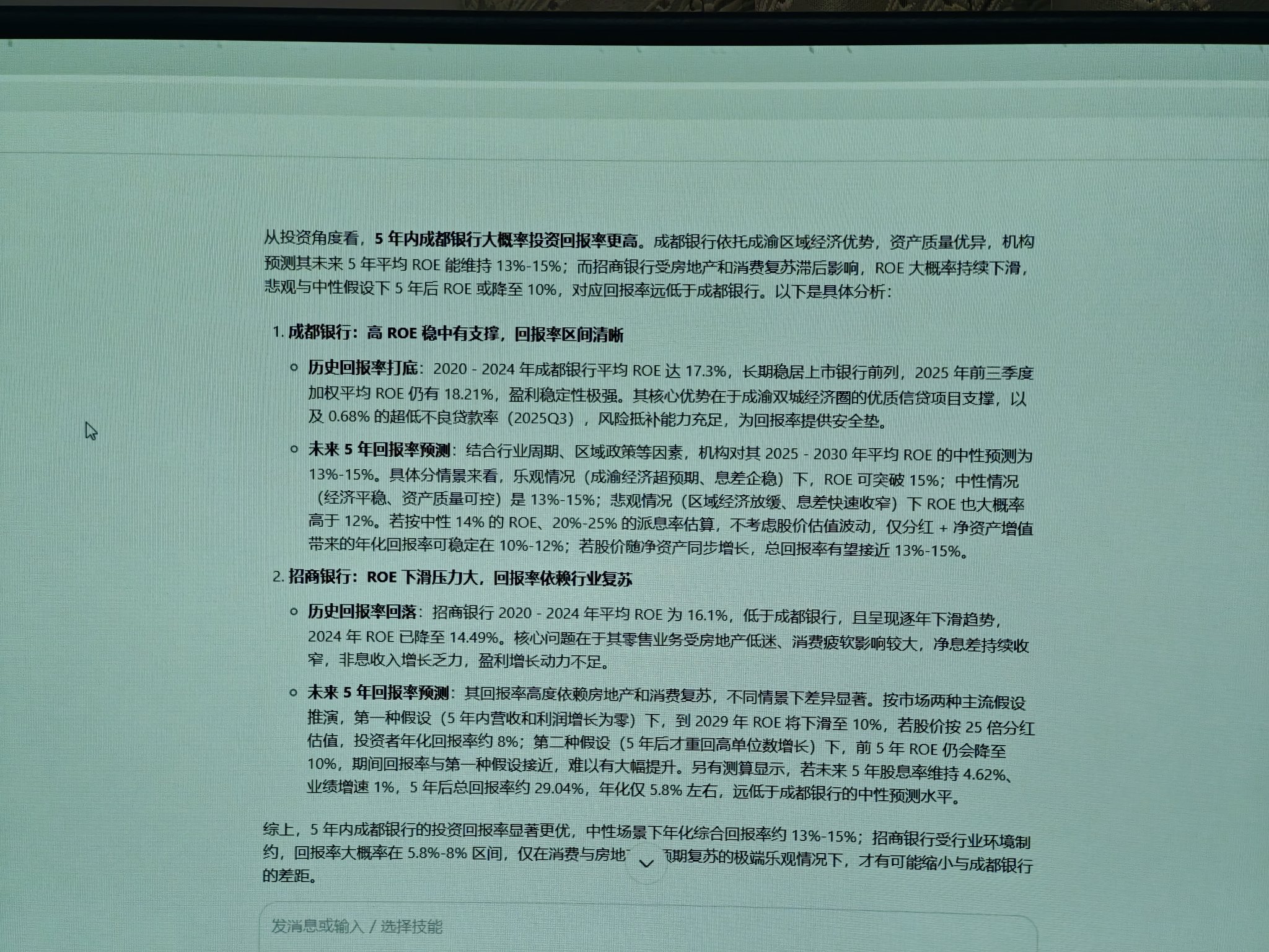 $招商银行(SH600036)$ 招商看样子与消费和房地产绑定太深,ai两种预测未来roe都会去到10%
