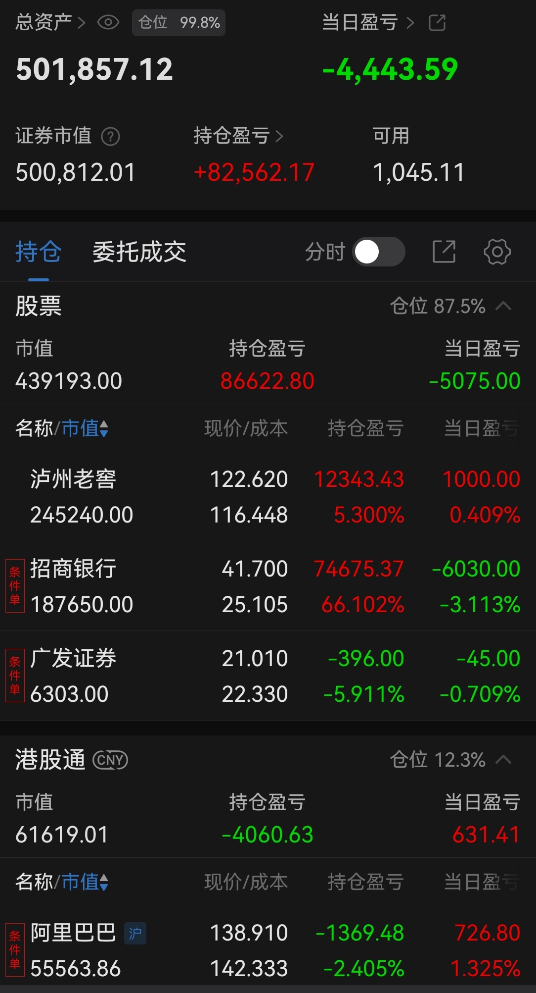 今天浮亏4400多元,无操作。今天主要是招行突然领跌。