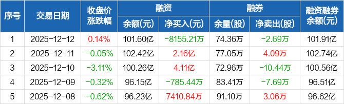 招商银行:融资净偿还8155.21万元,融资余额101.6亿元(12-12)