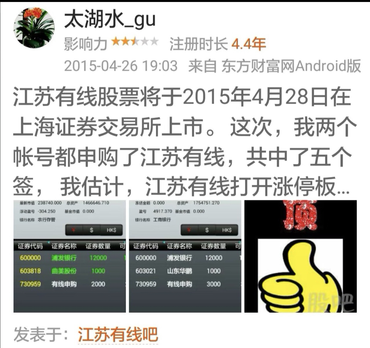 $招商银行(SH600036)$ 你有多长时间没有中到过新股了?是新股发的少了吗?是你资金少了吗?都不是,就是你中不到。看图片,这是我2015年4月发在东方财富上的图片,当年我的市值也不多,200多万,半个多月就中了七个签,一签曲美股份,一签山东鹏华,五签江苏有线,仅五签江苏有线上市后就赚了29万。十年后的今天,新股发行量增加了,我的市值也增加了,但是,一年下来,仅中了一个签。新股究竟是谁中了?