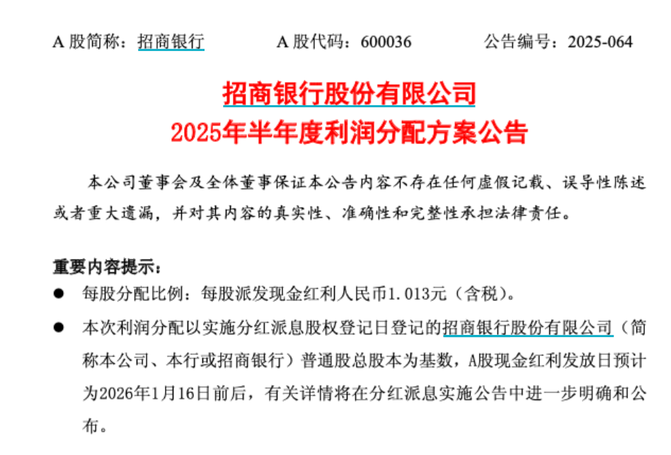 每股1.013元 招商银行拟于2026年1月16日前后派发半年度现金红利