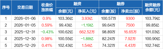 招商银行:融资余额103.36亿元,创近一年新高(01-06)
