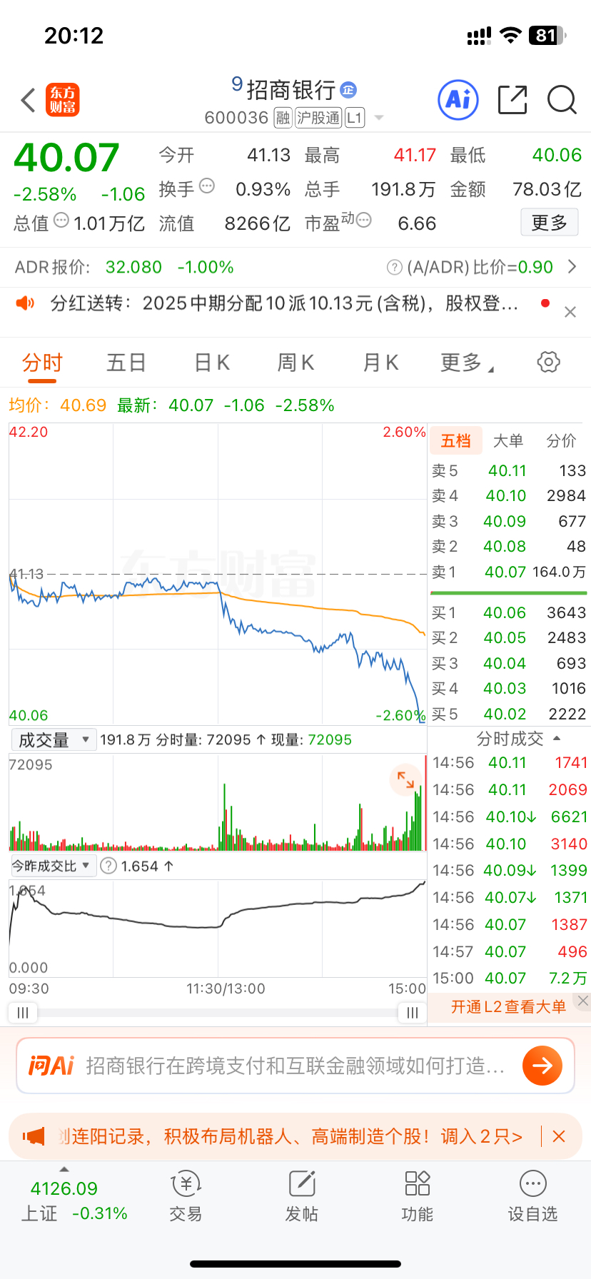 $招商银行(SH600036)$ 中午留意到证监会通知,融资保证金比例从80%上调至100%,我便意识到市场要迎来熟悉的调整。果不其然,下午开盘大盘就向下走,中途抵抗无效。尾盘招商银行罕见出现164万手、近64亿元的压单,这样的盘面表现并不令人意外。这波抛压,或许是融资盘恐慌出逃,也可能是主力刻意打压,但具体缘由无需过度揣测。后来翻看新闻才发现,长江电力同期也出现了10亿元规模的抛单。