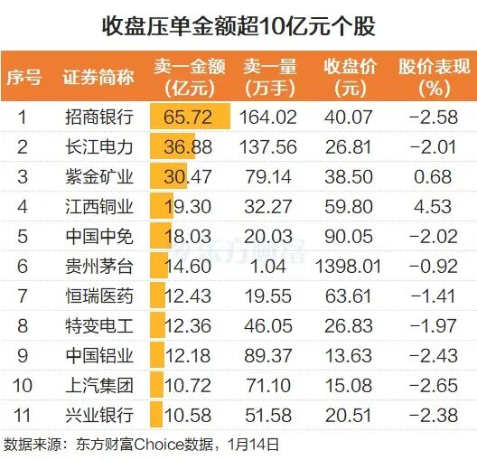 1月14日尾盘竞价阶段,多只权重股出现了巨额压单情况,也引起了投资者的关注。东方财富Choice数据显示,招商银行的压单金额最大,为65.72亿元。长江电力紧随其后,压单金额36.88亿元。整个A股来看,压单金额超10亿元的有11家,还包括紫金矿业、中国中免、贵州茅台、中国铝业等。