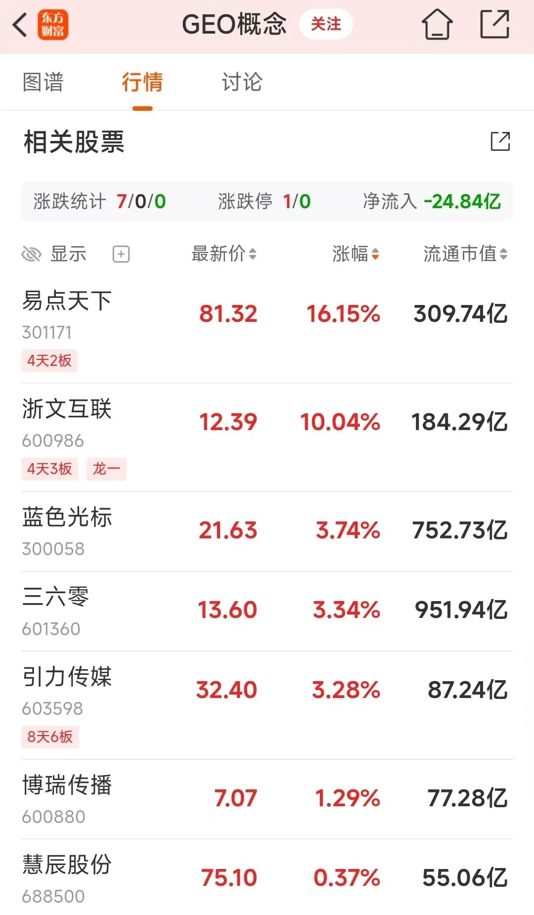 可从市场反馈来看,“降温”没啥作用。1月14日,GEO概念继续拉升,收盘涨了5.46%。板块中浙文互联涨停,易点天下大涨超10%。