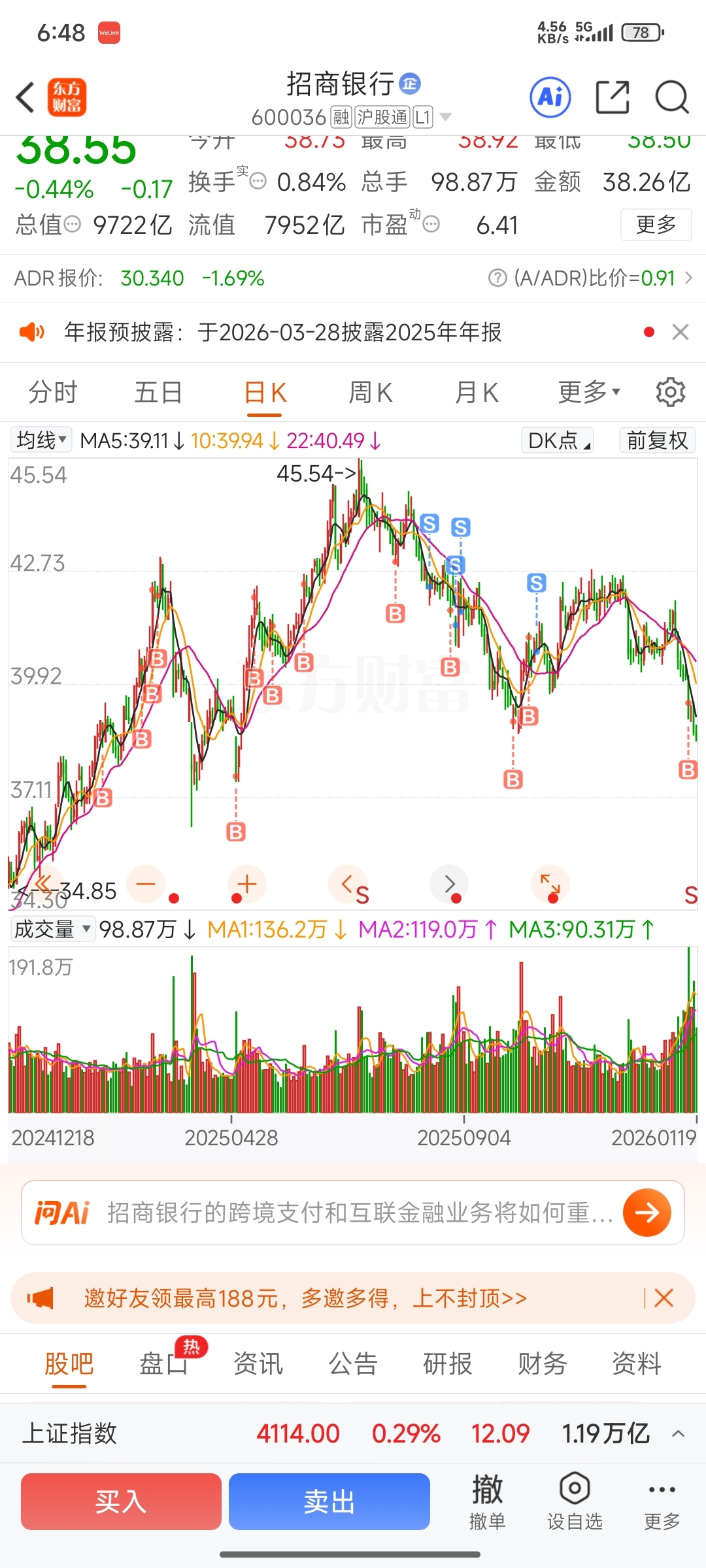招商银行,我是爱你的,继续跌就继续买,三年60,五年80,指日可待!