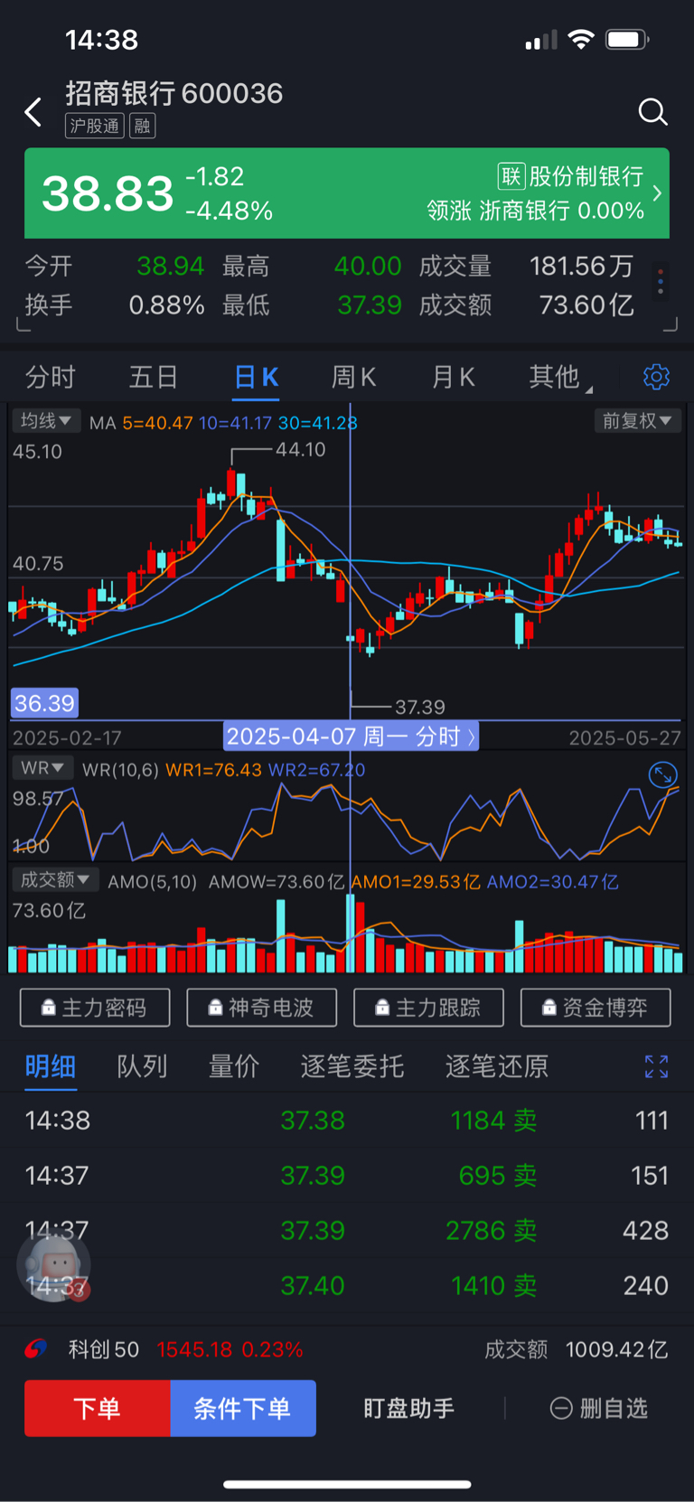 $招商银行(SH600036)$ 招行低于4月7日,准备抄汪江队的带血筹码