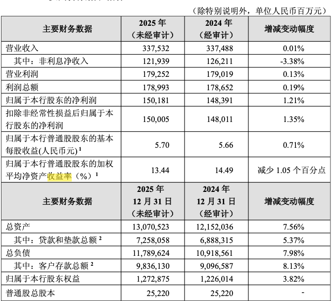 2025年,招行实现营业总收入3375.32亿元,同比微增0.01%;归属于母公司股东的净利润1501.81亿元,同比增长1.21%。