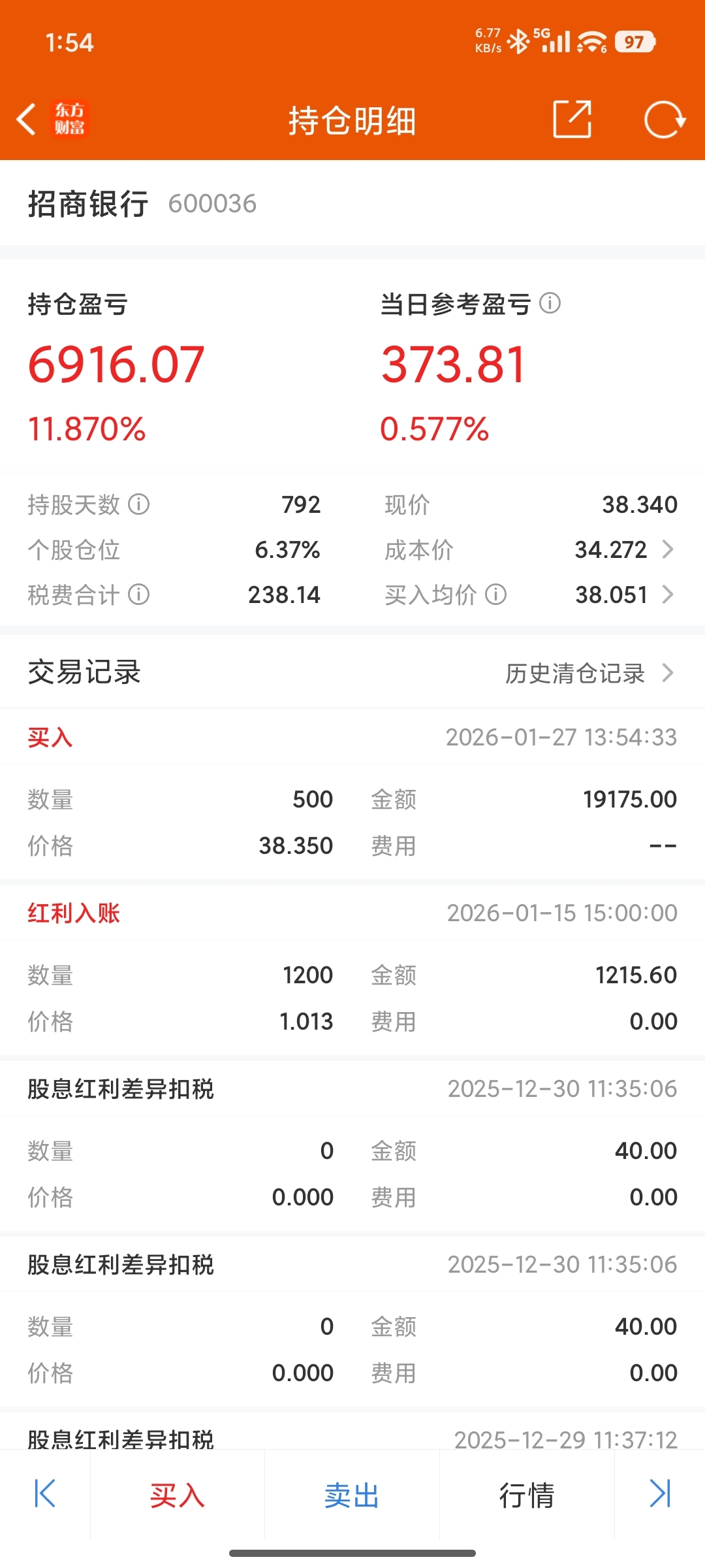 $招商银行(SH600036)$ 买入两万,做一个资金压底。#炒股日记#