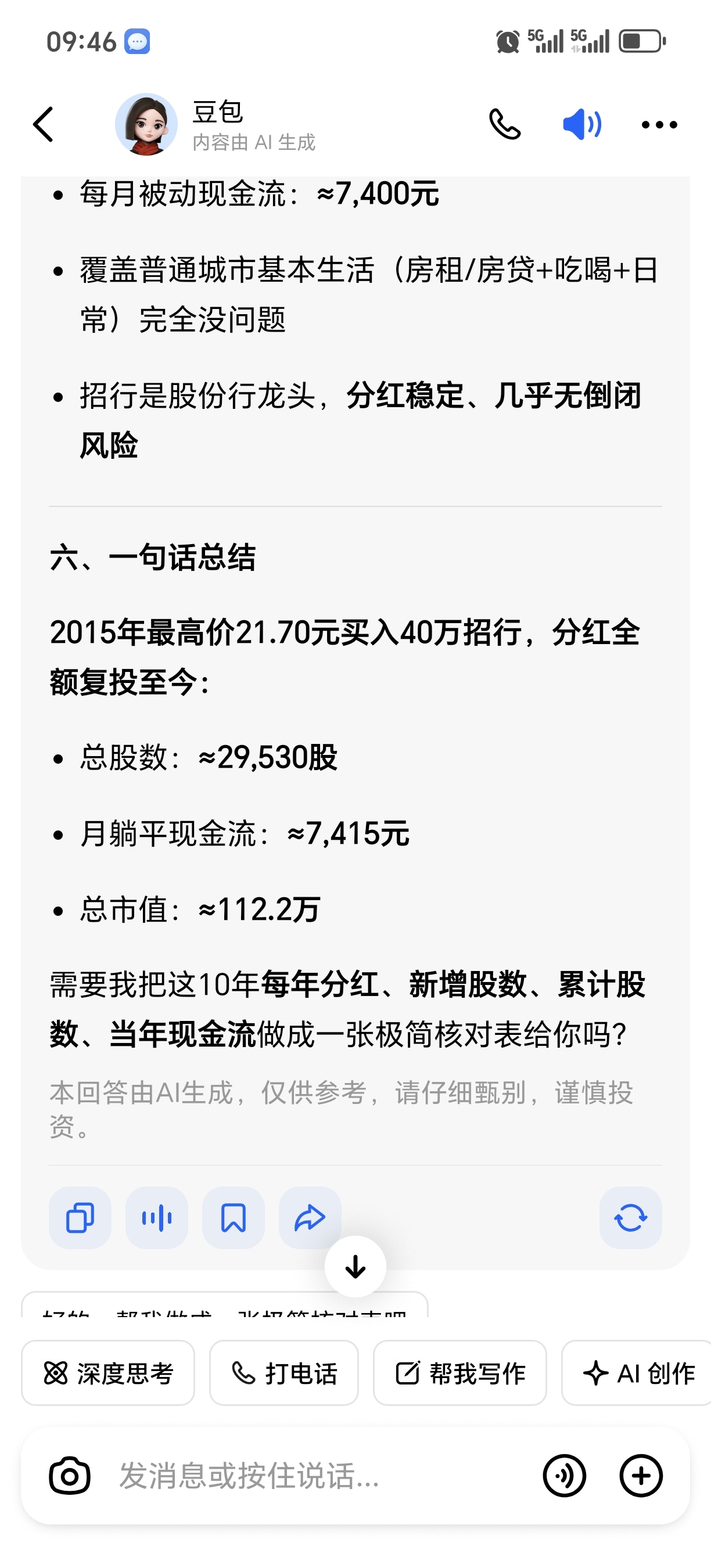让ai算了一下,2015年牛市泡沫最高点入手40万招商,现在每年能拿8万的分红,
