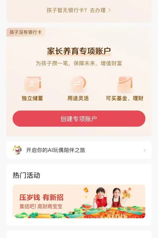 2月10日,记者在招商银行手机银行App上看到,该行在春节期间针对“压岁钱”在“热门活动”界面推出了专属直达路径,还有多款亲子账户、专属存款服务等。